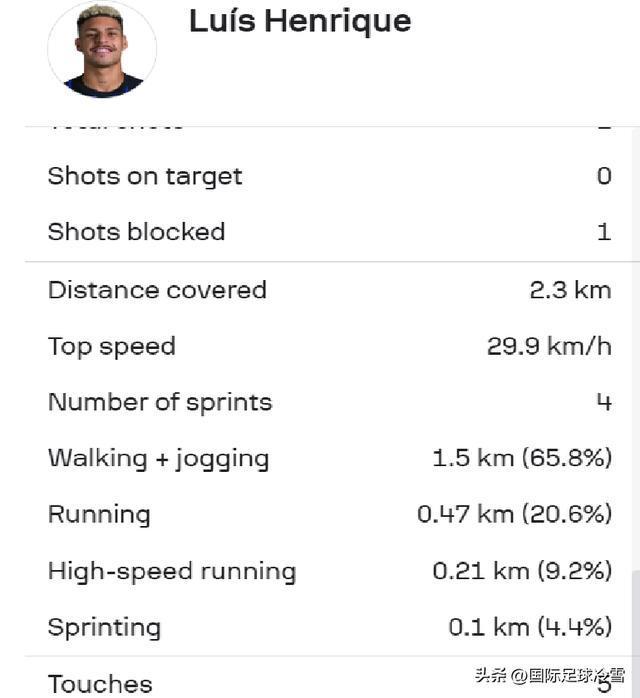 在这十几分钟比赛里,恩里克跑动覆盖达到2.3公里,其中他“高速跑”距离达到210米,占比9.2%。他有4次冲刺跑,“冲刺跑”距离101米,占比4.4%。
